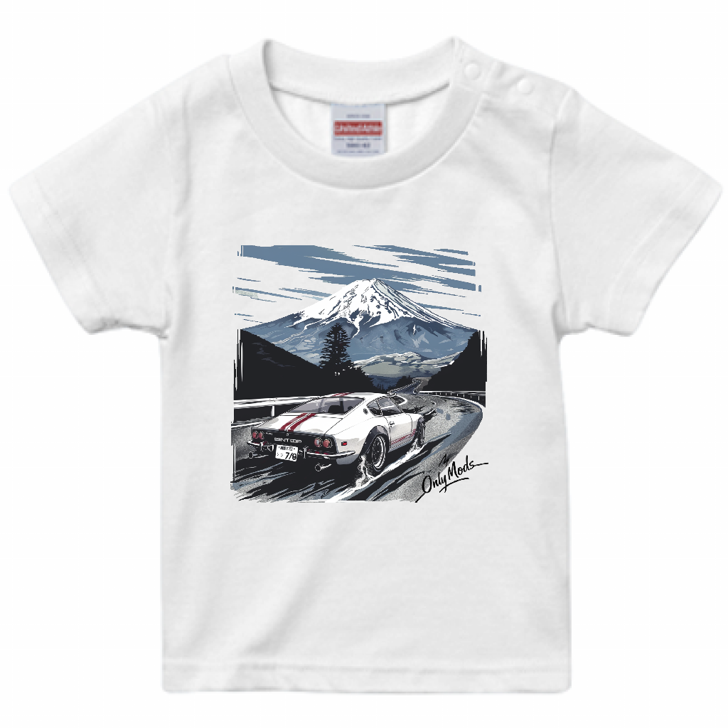Baby t-shirt, ukiyo-e style, Japanese sports car, Mt. Fuji in background